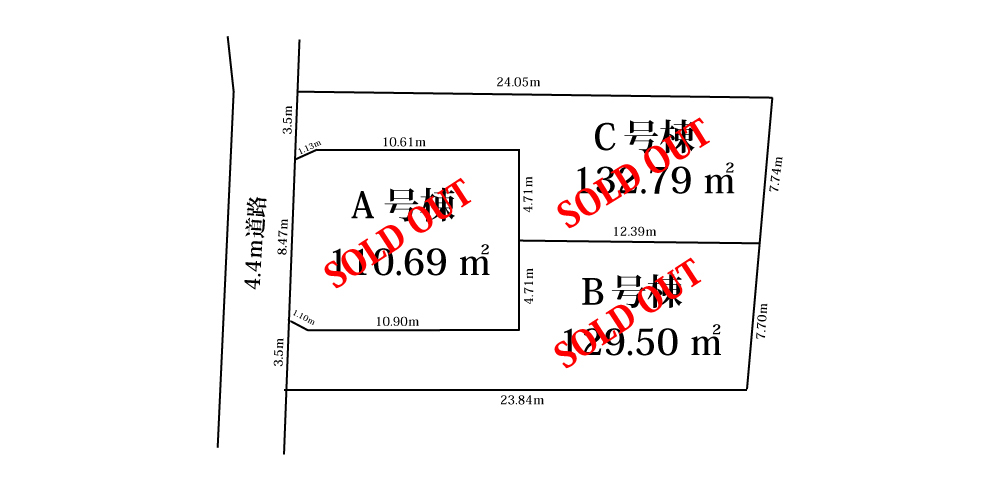 | 敷地面積 | A号棟 110.69 u B号棟 129.50 u C号棟 132.79 u |
