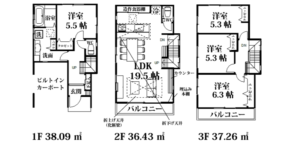 | 間取詳細 | LDK19.5帖・洋5.5帖・洋5.3帖・洋5.3帖・洋6.3帖 |
