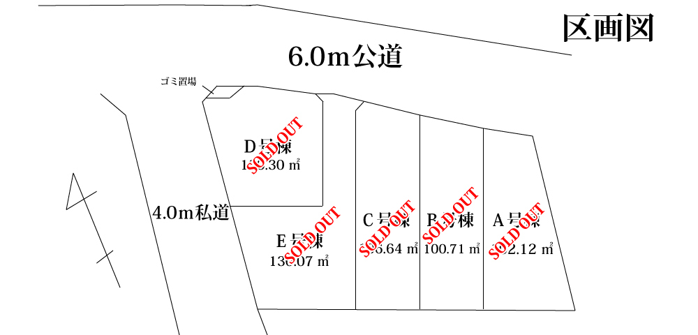 | 価格 | A号棟 成約済 B号棟 成約済 C号棟 成約済 D号棟 成約済 E号棟 成約済 |