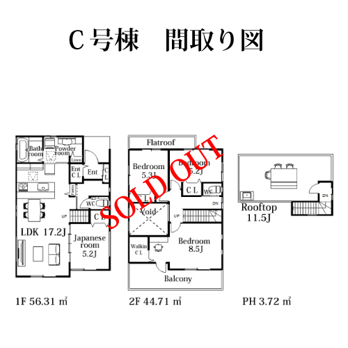 | 建物面積 | A号棟 101.53 u B号棟 105.16 u C号棟 104.74 u |